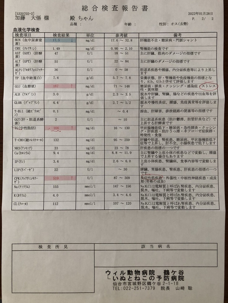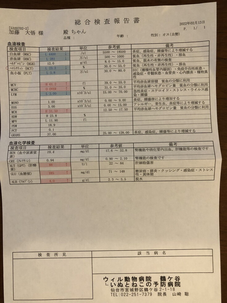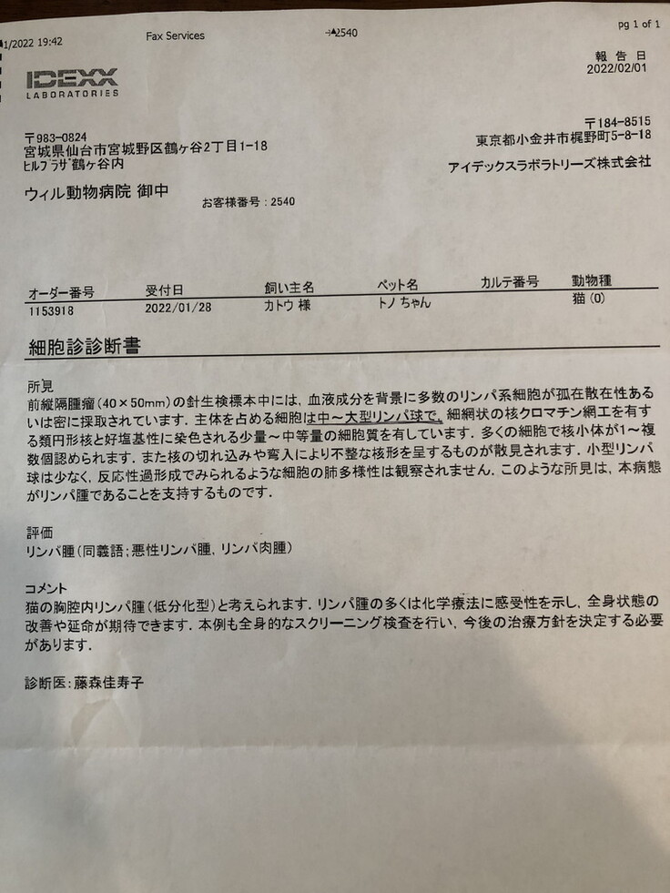 ウイルス性の胃腸炎とのことで、嘔吐止め、点滴の処置を受けましたが、1週間ほど経っても食欲が戻らず、再び受診したところ、血液検査、レントゲン、エコー、細胞診などの検査をして、悪性縦隔リンパ腫の可能性が高いことがわかりました。