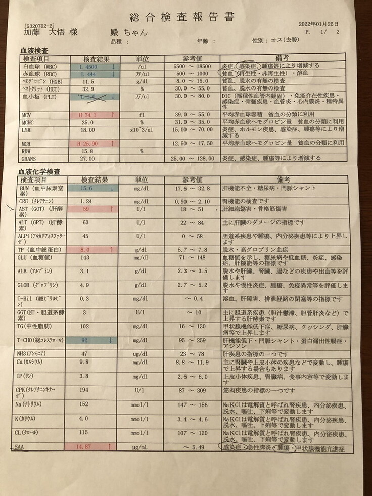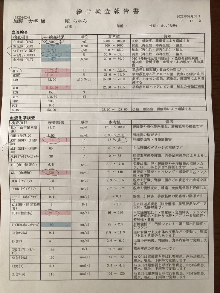 抗がん剤については、プロトコールは【変更型NCSUのプロトコール】が採用されましたが、1週目の血液検査で貧血が見られたため、1週目で投与する薬剤を2週に分けました。現在、2週目を終えたところですが、体調を見て調整頂いているため、1クール終えるまでに、10週前後掛かります。1クール終えたところで、状態を見つつ、2クール、3クールと続きます…