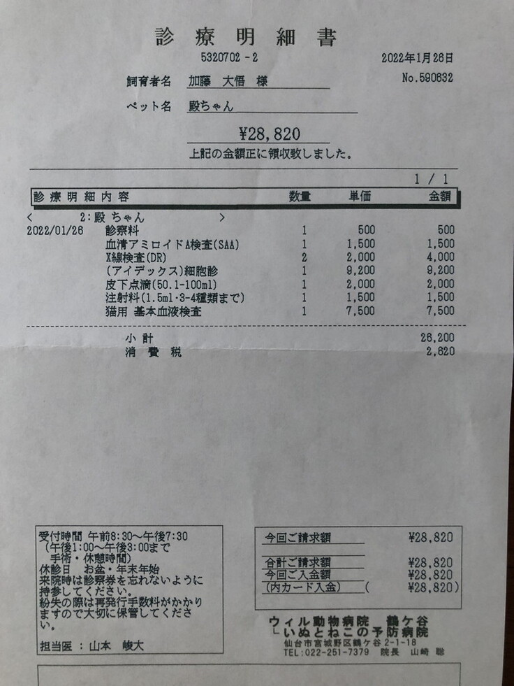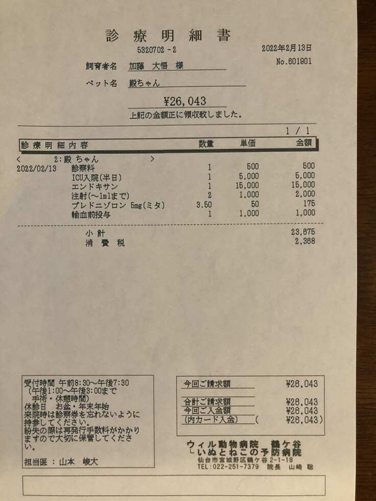 これまで40万円(手元に届くご支援金額:約35万円)を目標額としてきましたが、殿の治療を進めていくと、当初、想定していなかった事が多々あり、総額の治療費が2.5倍から3倍近くになってしまう事がわかりました。