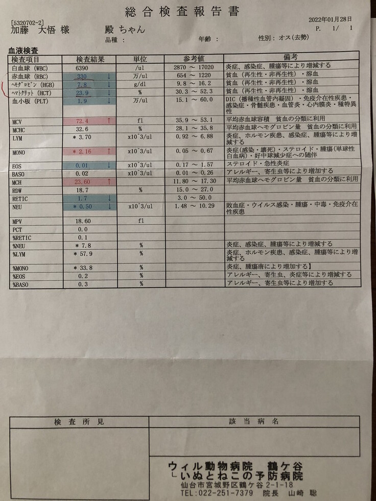 貧血の症状もある為、状態をみて輸血する事もあります。
