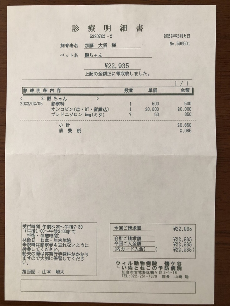 でも、まだ、できることがあるなら早い方が良いと思い、診断当日と翌日に、脱水を防ぎ、抗がん剤治療ができるように補液とステロイドを注射してもらい、翌々日から抗がん剤による治療を開始しました。