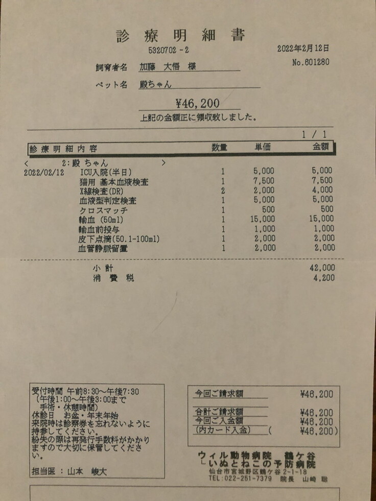 万が一、殿が亡くなってしまった場合、頂きました支援金はこれまでに掛かった抗がん剤治療費や輸血等、その他の治療費・診療費に充てさせていただきたいと思います。