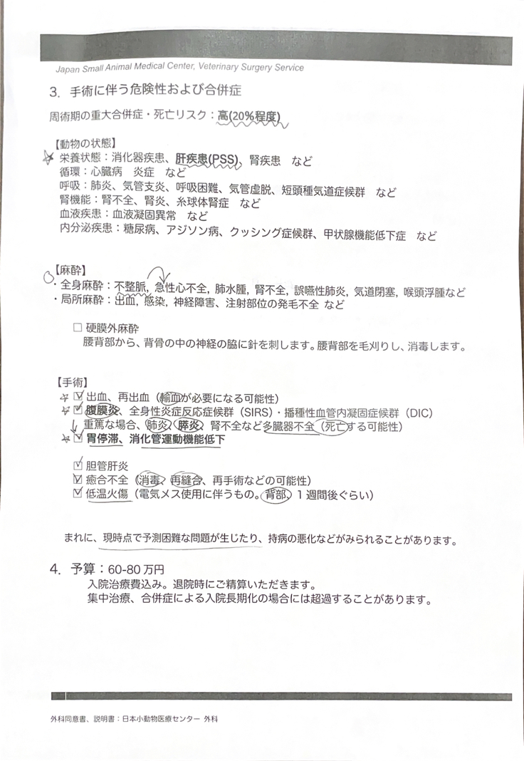 手術をしないと後に死に至可能性が高いのですが、正直悩みました。何故なら持病の門脈体循環シャントがあり、血が止まりにくく癒着のある若君にとっては通常の倍以上のリスクが有るからです。