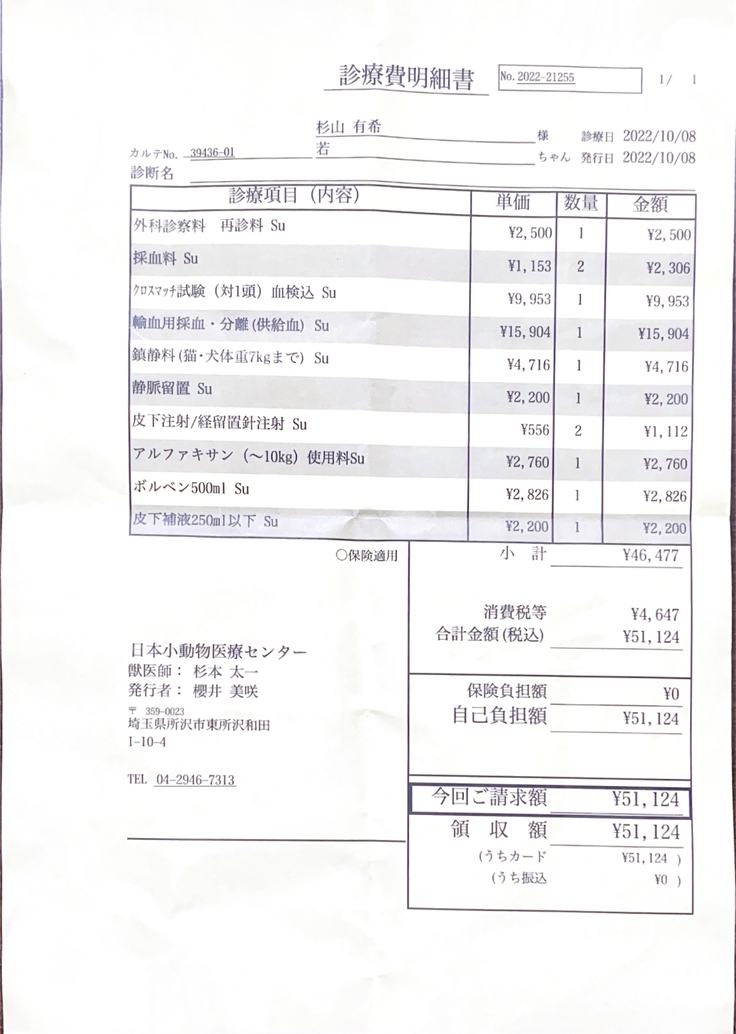 10/9 殿君が輸血出来るか若君と適合検査及び献血の為 51,124円