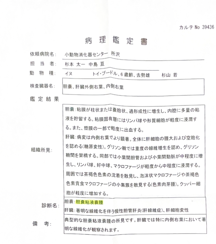 胆嚢粘液嚢腫は重症でした。破裂前に取れて一安心です。