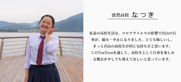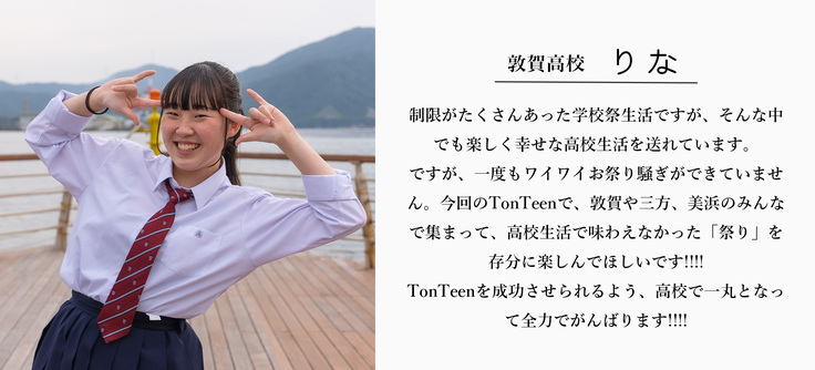 敦賀と美方の高校生が合同で文化祭を行うために活動している実行委員会です。 学校という障壁を越え、新たな繋がりや様々な挑戦を敦賀市の町と一帯となり、アフターコロナの世界を高校生が作ります。TonTeenを「新たな敦賀の文化や伝統」にするため、日々活動を行っています。