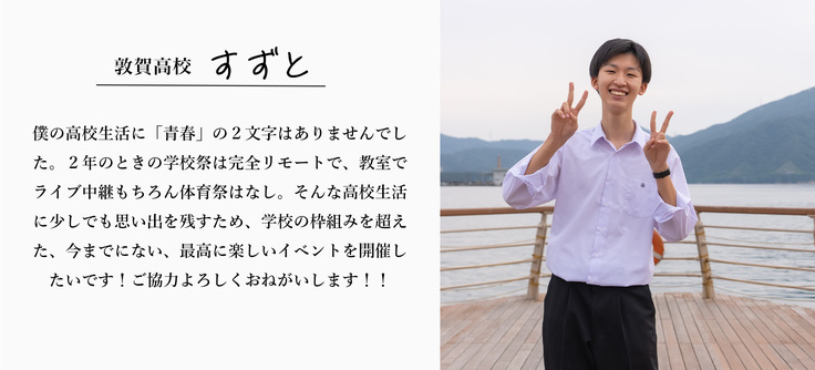 敦賀と美方の高校生に思う存分に楽しんでもらえるような文化祭にします!!これからも引き続き、応援の程、よろしくお願いいたします。