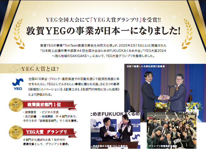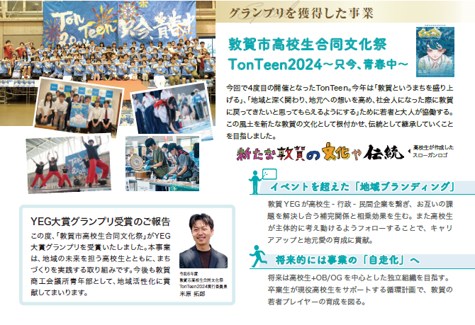 TonTeenをサポートしてくださっている敦賀商工会議所青年部の事業として、「敦賀市高校生合同文化祭TonTeen2024~只今、青春中」がYEG全国大会にて「YEG大賞グランプリ」を受賞しました。