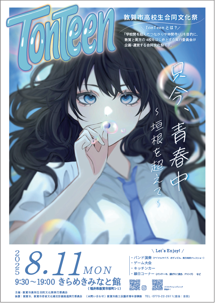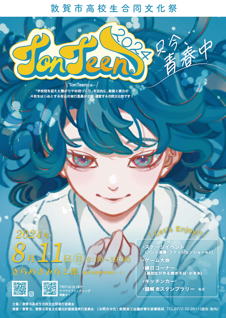 「TonTeen」の名称は、「敦賀の敦:Ton」と「10代の若者:teenager」を合わせた造語で、失われた学校生活を取り戻すこと・コロナ禍から脱却すること・学校間を越えて友達をつくることを目的に、4校の生徒(敦賀・敦賀気比・敦賀工業・美方)が力を合わせて青春を取り戻そうと企画しました。