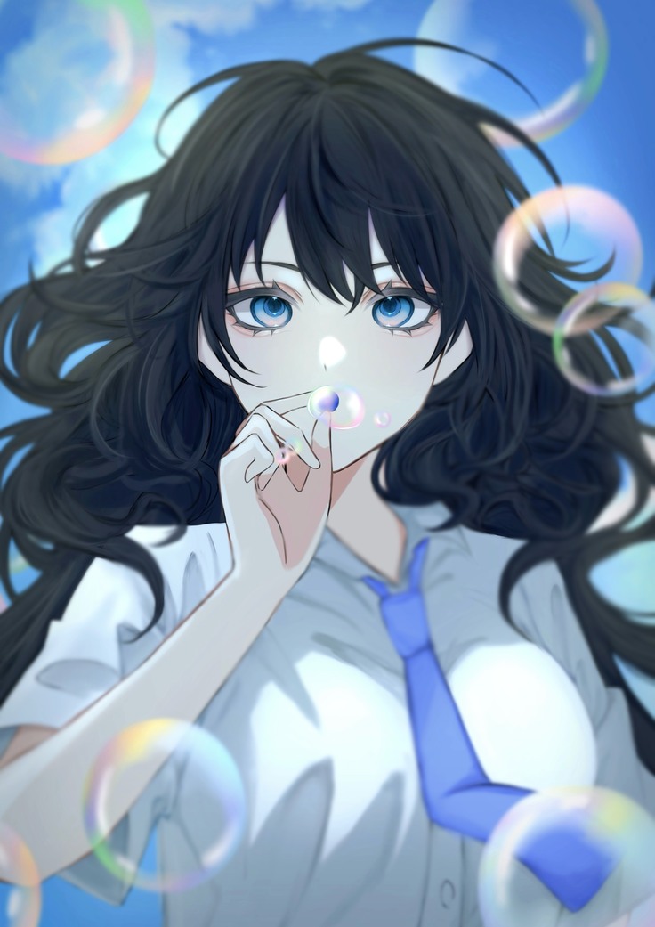 「シャボン玉は、一瞬で消えてしまうことから、儚さや無常を象徴します。また、反射して虹色に輝く様子は、希望や夢を表すこともあります。このイラストには、「過ぎ去っていく時間の儚さ」や「夢や希望」といった意味が込められています。シャボン玉は美しく輝きながら空に舞い、やがてパッと消えてしまいます。その一瞬のきらめきは、まるで高校生活のようだと私は思いました。毎日が楽しくてキラキラしているのに、その楽しい時間はあっという間に過ぎ去ってしまいます。また、空に飛んでいくシャボン玉には、未来への希望や夢なども込められていて、成長途中である私たち高校生の姿とも重なります。このイラストは、短くて、かけがえのない高校生活を大切にしようというメッセージを込めて描きました。」