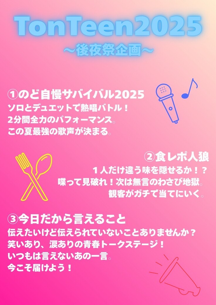 当日は演者も見ている人も楽しめるTonTeenになること間違いなしです!