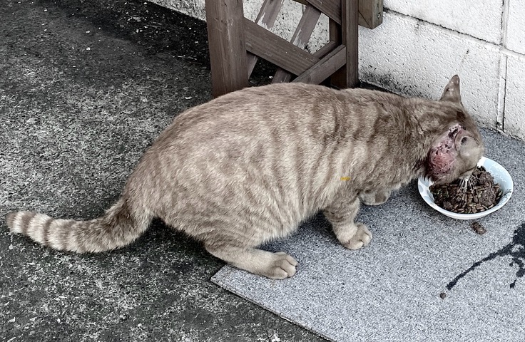 毎日ゴハンに薬をいれて少し良くなってくると、また掻きこわしたり…動物病院では室内飼いが1番の薬といわれ、捕獲して事務所に入れられないかと考えましたが、当時はバリバリの外猫ちゃんでしたので難しい相談でした。