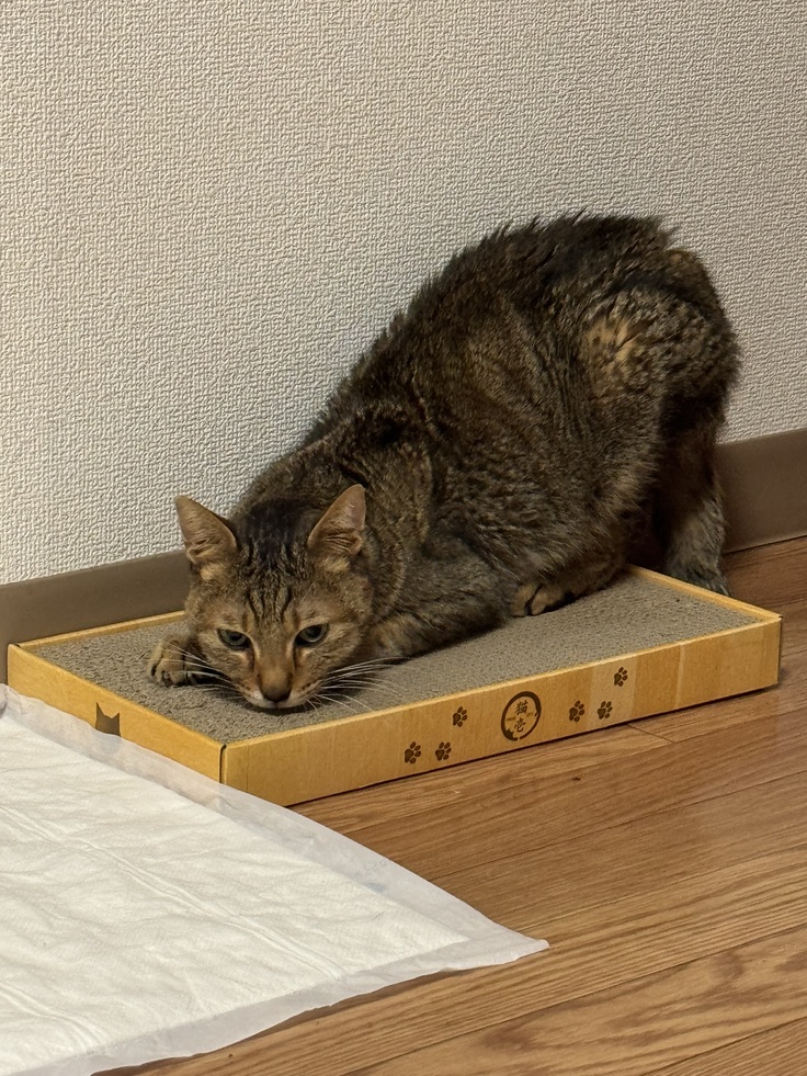 ここでくつろいで、移動しなくてもすぐ爪とぎできるからかこの爪とぎがお気に入りです☺️