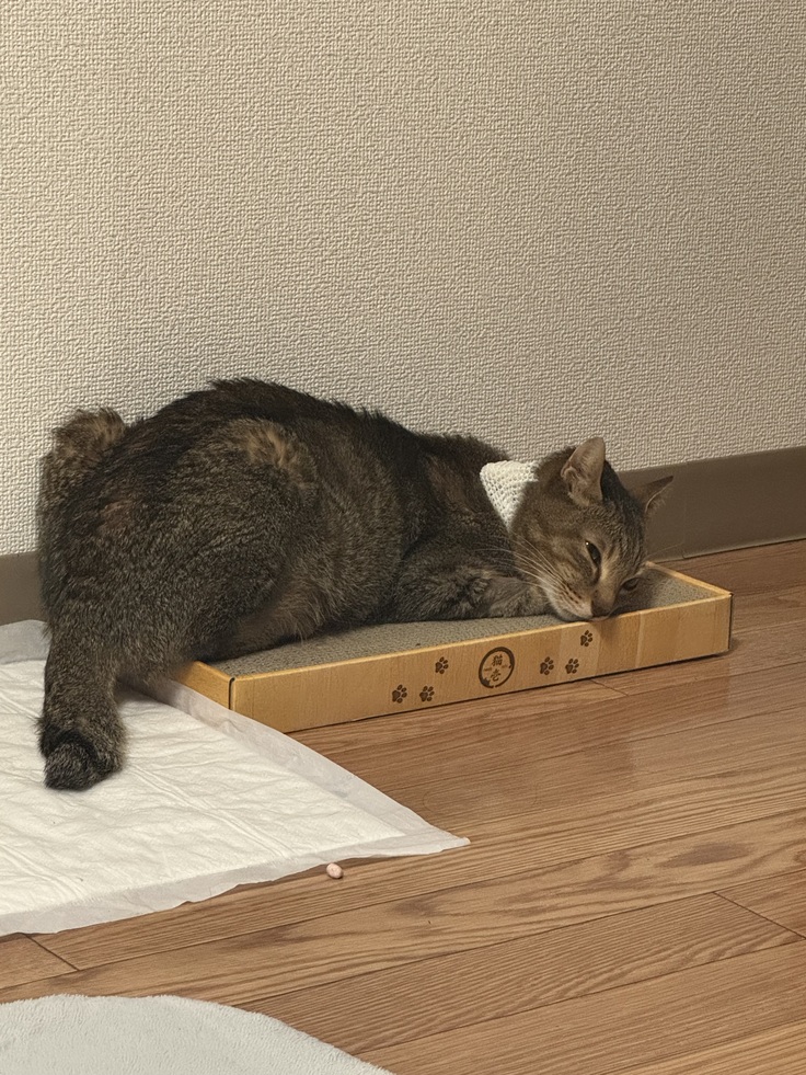 今はおうちで落ち着こうとはしてくれているのですが、足元はまだおぼつかず、横になるのも少し難しそうな状態です。