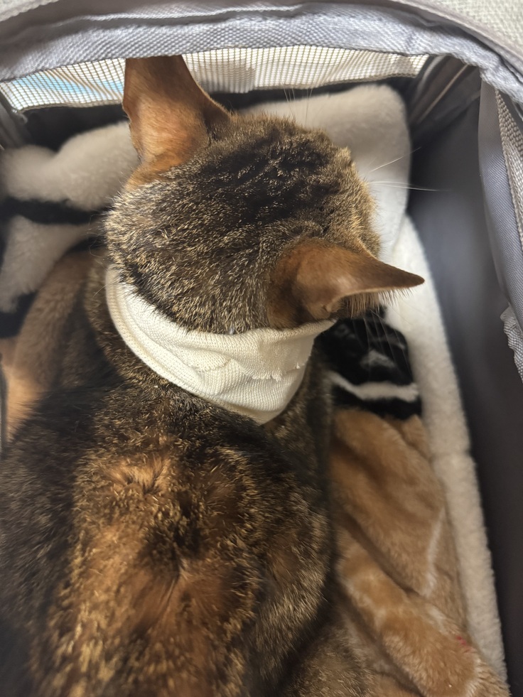病院では、この間の検査結果のお話をして、これからの方針、ご飯やお薬のあげ方などをお話し、皮下補液を打っていただきました。