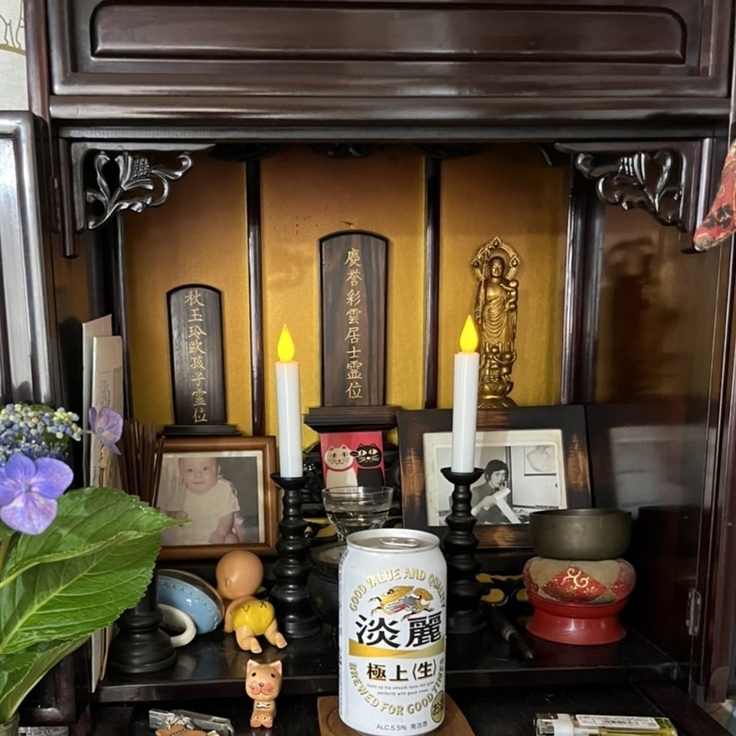 母に頼んで仏壇に酒好きの父へ缶ビールを供えてもらいました。