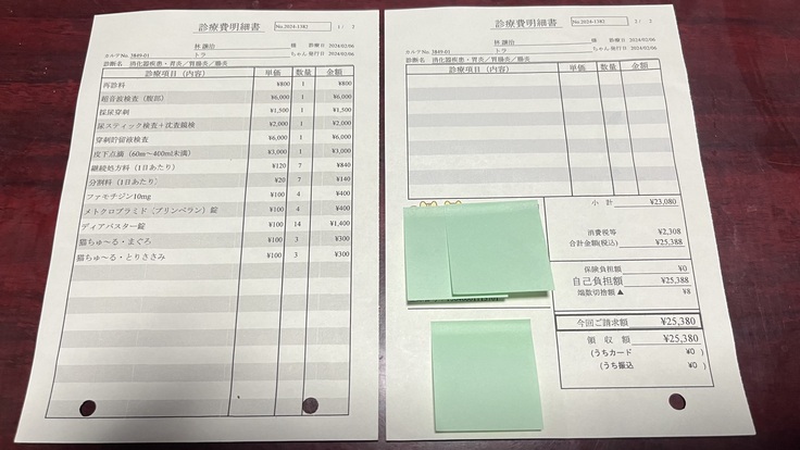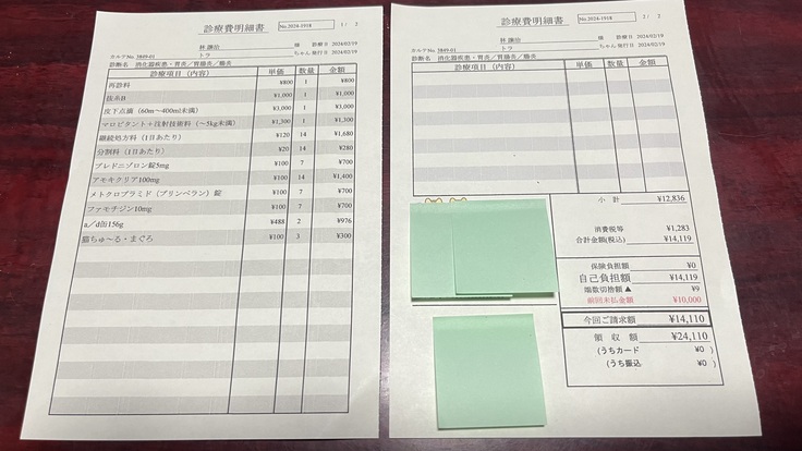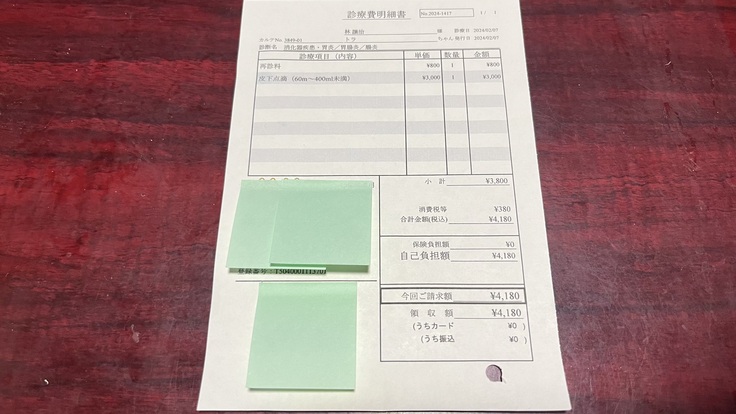 内視鏡検査に伴う各種検査等複数及び麻酔費用など発生しました。また病理組織検査の関係で、開腹手術も行いました。検査は無事に終わり、病理検査の結果は、1〜2週間後の結果待ちとなりました。