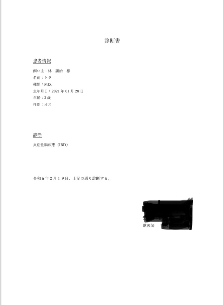2024年2月19日、愛猫のトラちゃんが 炎症性腸疾患 の治療が必要と診断されました。