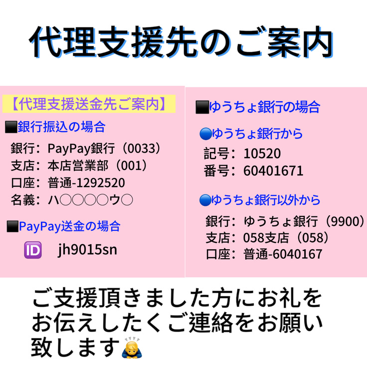 ❷標記(写真掲載)の口座へ銀行振込、またはPayPay送金でご支援金を送金ください。