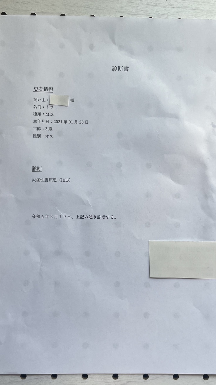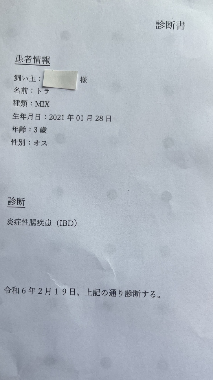 ⚪️トラちゃんが炎症性腸疾患(IBD)の診断を受けるまでの経緯の概要をまとめましたので、診断書と併せて掲示致します。