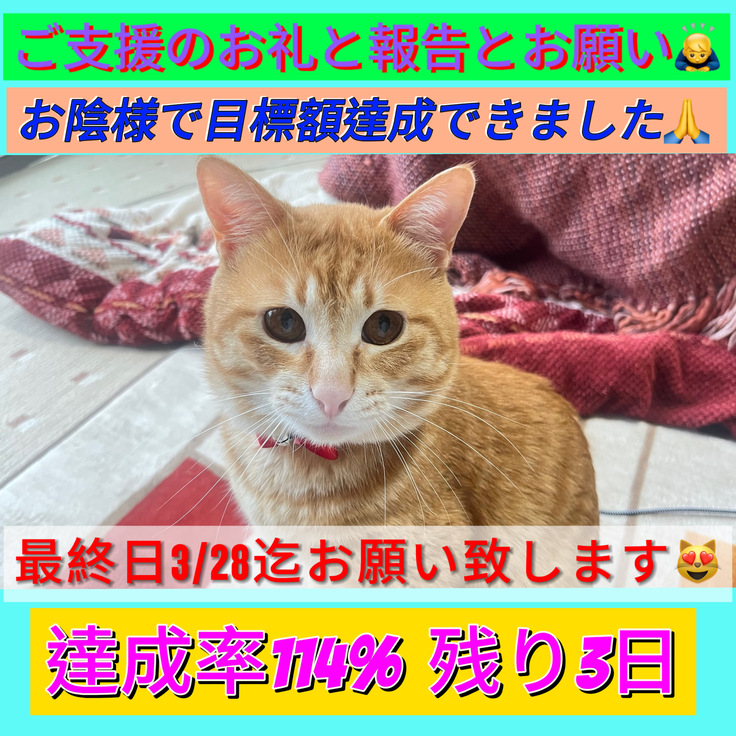 3/21投稿『最終日28日迄のお願いにつきまして』でご案内の通り、トラちゃんのプロジェクトはこのままの状態で最終日の3/28 23:00迄継続しまして、恐縮ではございますが、無理のない範囲でのご支援をお願いしております🙇♂️😻🙇