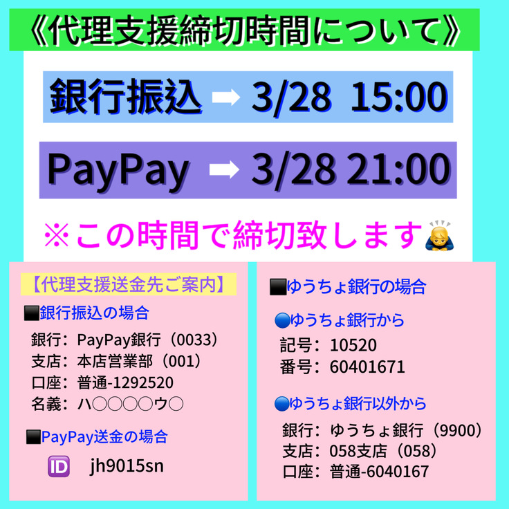 ❷標記(写真掲載)の口座へ銀行振込、またはPayPay送金でご支援金を送金ください。