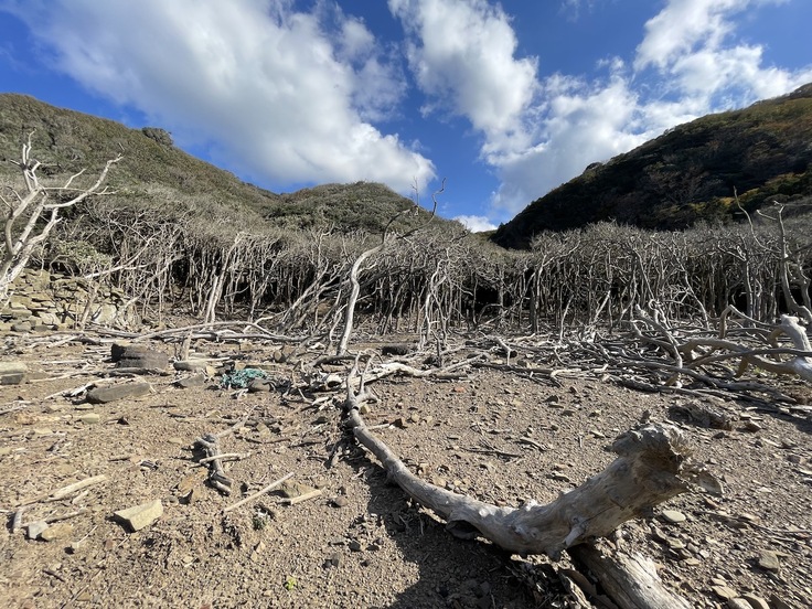 枯れ木の林の中はシカのフンでいっぱいでした。