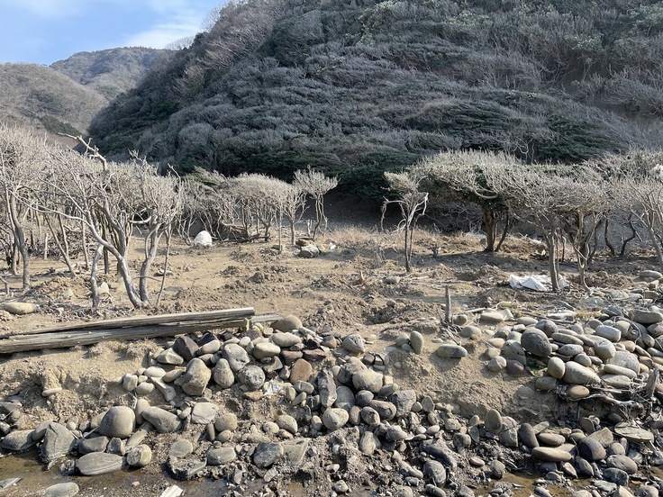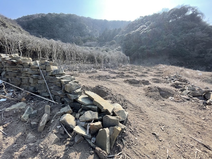 藻小屋跡の石垣がある部分は少し内陸側に植樹します。