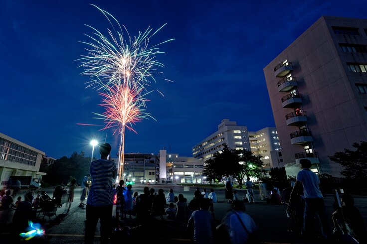 今年も、皆さまよりご支援いただきました資金で子どもたちに笑顔を届けることができました。約13分間で、約300発の打上花火と、花火が滝のように流れる「ナイアガラ」がとりだい病院の夜空を彩りました。