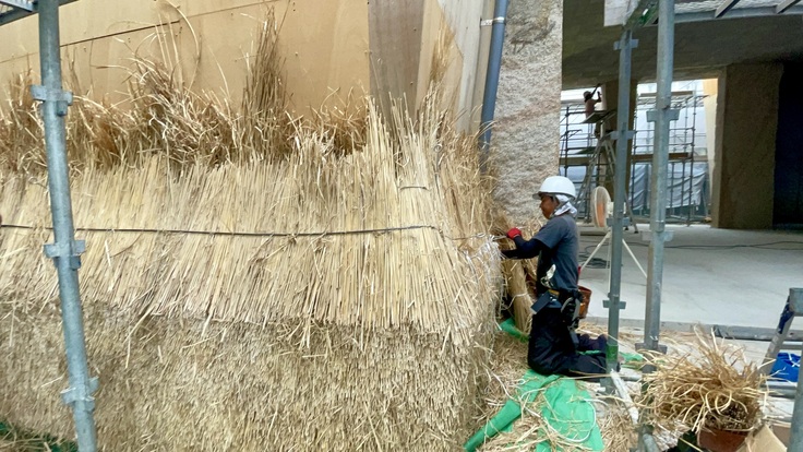 茅葺(かやぶき)は、伝統的な建築素材で失われつつある技術です。現在は茅葺職人は日本に200人ほどしかおらず、また材料のイネやススキなどを確保することも難しくなっています。その技術を今後も継承するために、茅葺壁としました。これほどの規模の茅葺の壁は、日本でも類を見ないのではないでしょうか。