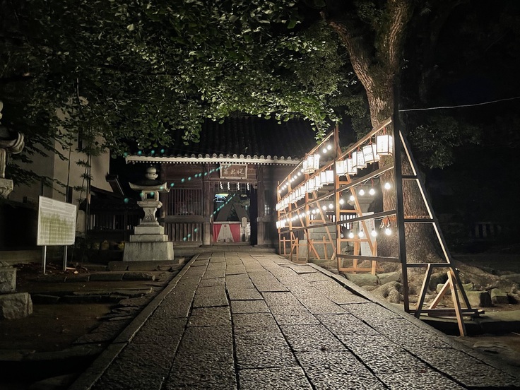 7月のこの時期は夜、参道には灯明が灯りました。今年は神門の内に灯っています。来年以降はどこに櫓を建てるのかはまだ検討中です。