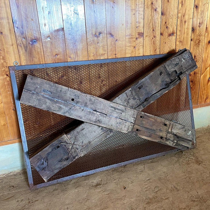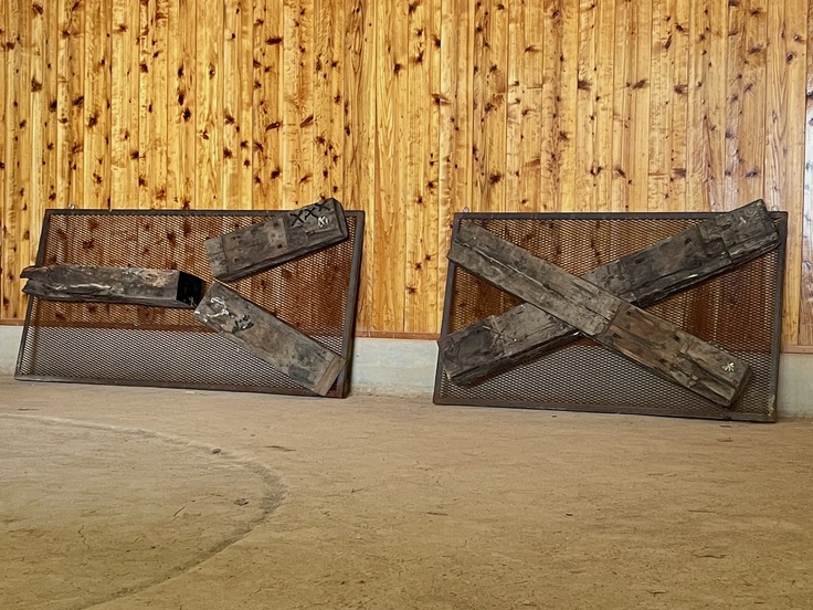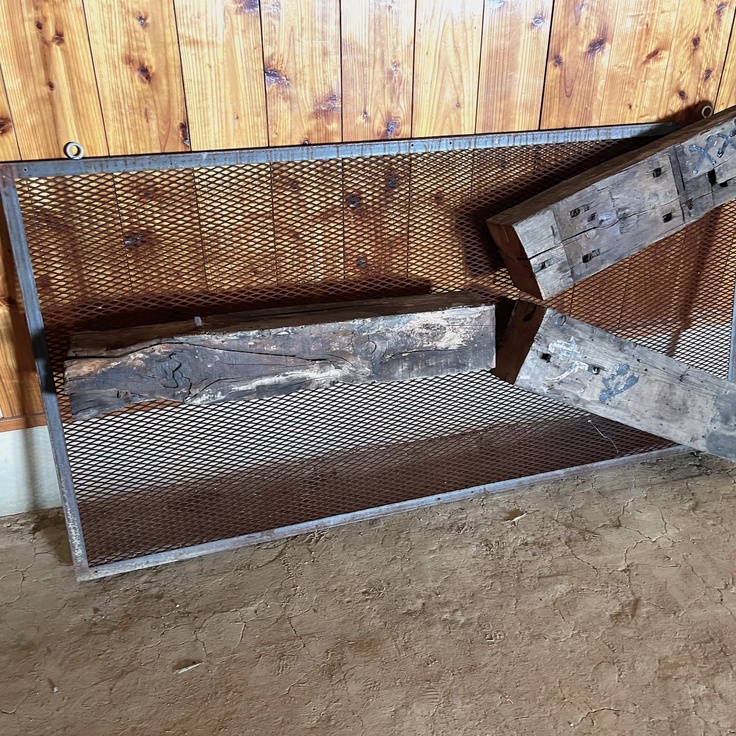 作品の素材は、建材の金網と、使用済みの枕木です。