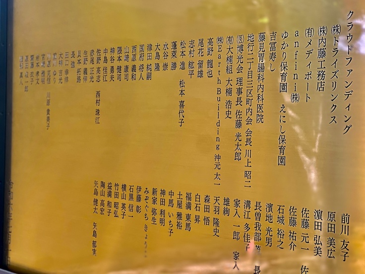 プロジェクトの中で金属銘板表記の支援をいただいき、ご希望された方のお名前が刻まれております。