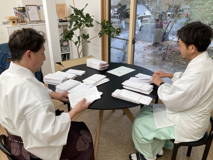 本日は、みなさまに宮司からのお礼の手紙の発送作業を行いました。