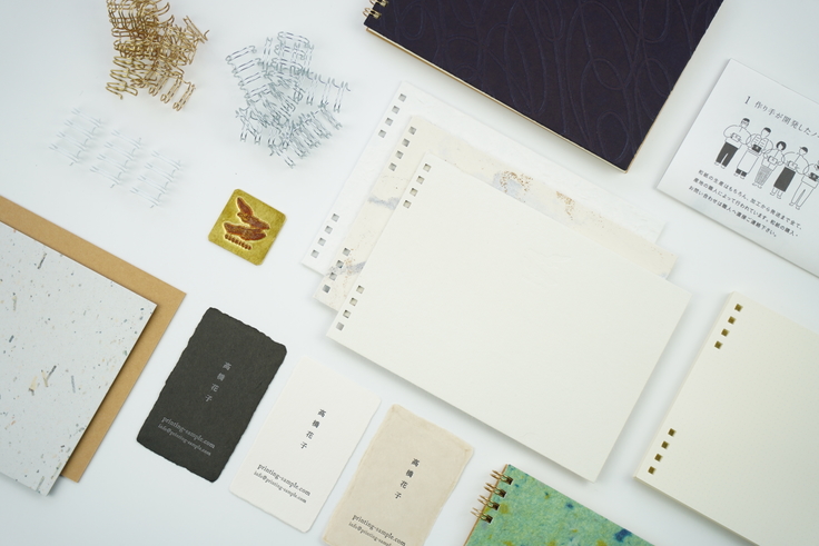 製本会ではオーダーノートをメインに販売いたします。その場で和紙100種から表紙、数種類の紙から中紙、リングの綴じ方、3色のリングからお選び頂き、製本してお渡しします。そのほか和紙の展示など。