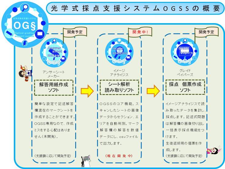OGSSはシート作成ソフト、画像解析ソフト(シート読み取りソフト)、採点個票作成ソフトから成り立つ想定です。今回のプロジェクトで作成するのは、画像解析ソフト(シート読み取りソフト)になります。
