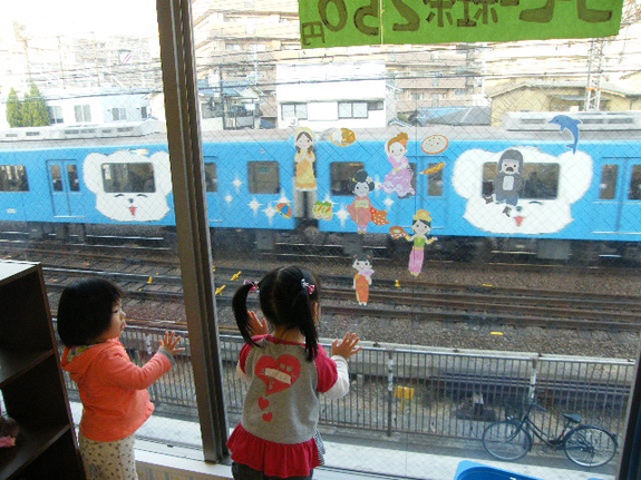(電車が観れるぽかぽかカフェの特等席は子供達に人気です)