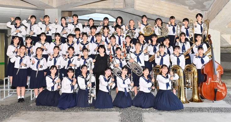 「自己に厳しく、そして素晴らしい伝統を」をモットーに、中学1年生から高校3年生まで、49名の部員が一丸となって、日々、切磋琢磨しながら、演奏会やマーチングを始め、地域のイベント出演等にも、積極的に取り組んでおります。