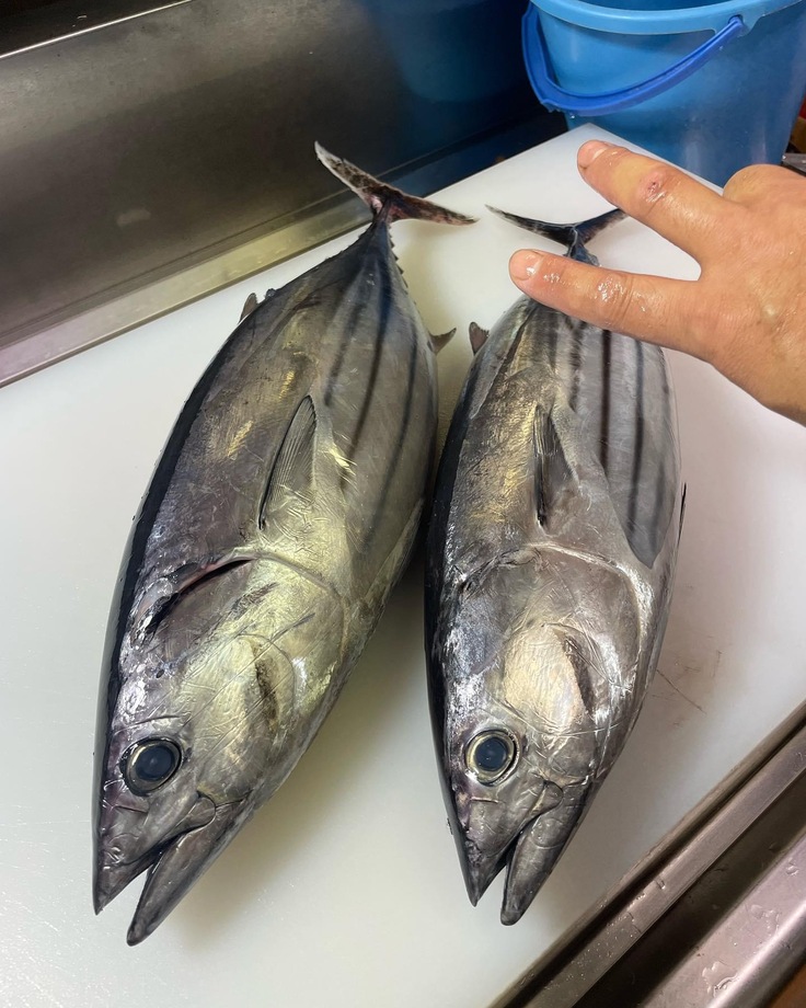 カツオを捌くところから藁焼き・盛り付けを体験してもらうのに、4〜5キロはあるまるまるとしたカツオを用意してくれ、まな板の上に乗せて裁き方をレクチャーしている途中で、「これはいかん!もっとうまいのがいる」と、カツオを取り換えたのです。