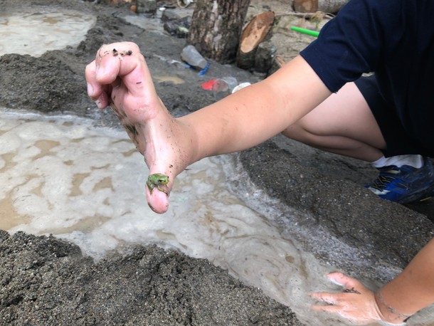 アマガエルが大量発生してる校舎横に行くと、ウジャーっと小さなアマガエルが!