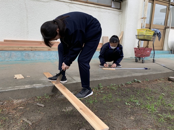 木の上で寸法を測り、下では女子がのこぎりの作業を。