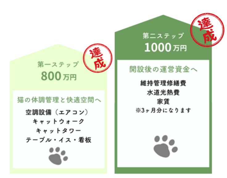 第一ステップでは、800万円を目標に、猫たちの体調や快適な環境を目指し、空調設備やキャットウォーク、キャットタワーが設置できます。猫カフェに必要なテーブルやイス、看板なども揃えて、おもてなしの準備もできればと思っています。