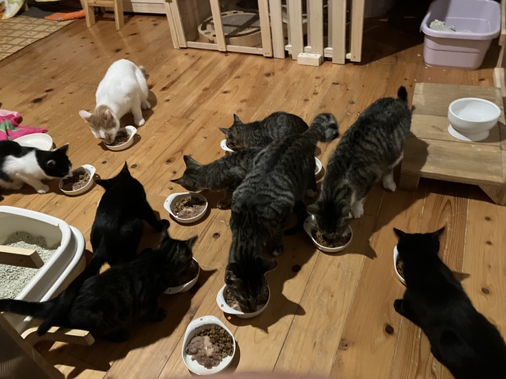 (子猫部屋の朝ごはん、隠れて食べる子も)