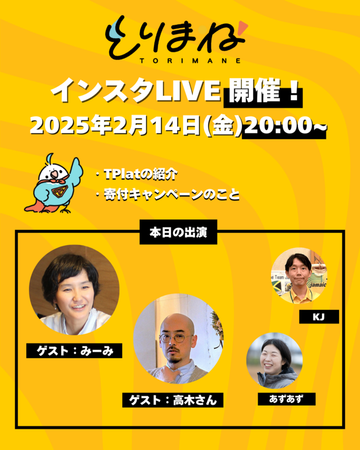 とっとりコミュニティ財団設立準備会のInstagram(@tottoricf)が不定期で開催している準備会の中の人のインスタLIVE。今回の特別ゲストは、先ほど応援メッセージをご紹介した「(一社)鳥取クリエイティブプラットフォーム(TPlat/ティープラット)」のみーみさんと高木さんをお迎えします。ぜひゆるりとご視聴ください。