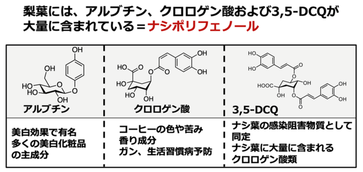 私たちは、鳥取県特産品であるニホンナシ‘二十世紀’の葉は、果実と比較して3,5-ジカフェオイルキナ酸 (3,5-DCQ)、クロロゲン酸およびアルブチンなどのポリフェノールを多量に含有していることを発見しました。これらのポリフェノールを“ナシポリフェノール”と呼称しています。
