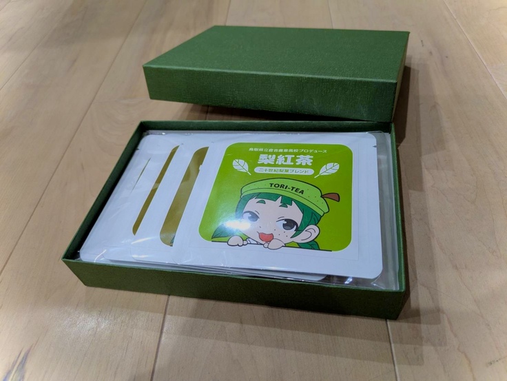 梨葉茶4種セットには、梨葉茶と紅茶やバタフラーピーをブレンドしたものです。梨葉以外の茶葉やバタフライピー等も鳥取県産のものを使用しております。また、パッケージは鳥取県立倉吉農業高校の生徒がデザインしました。