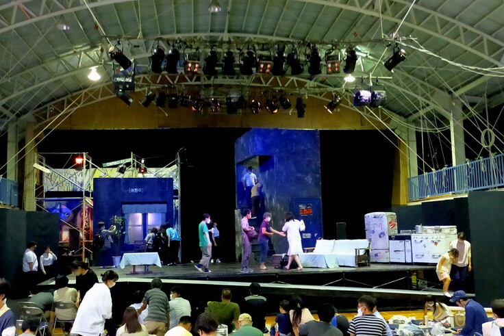 舞台、セット、照明、音響、すべてを劇団が持ち込んで、劇場がなくても体育館があれば本格的な演劇が楽しめる、場所を選ばないバリアフリー。