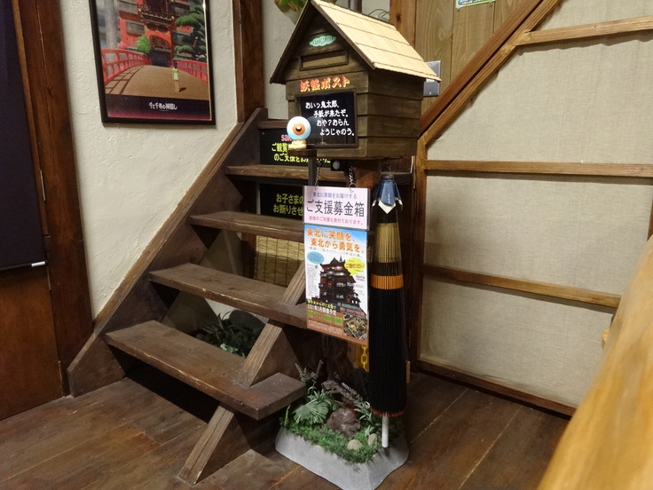 東北に笑顔が戻るように、元気が出るように、そんな思いに共感していただいた方々が次々に、ゲゲゲの妖怪ポスト支援募金箱へ温かい気持ちを入れてくださいました。おカネを入れると目玉おやじが話しかける仕掛けにも興味を持っていただいたようです。