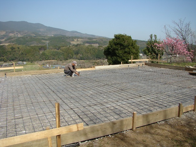 明日のコンクリート打ちに備えて、水平を確認しコンクリートの深さを決めるための杭(鉄筋)を打つ作業と、基礎部分の給排水管の設置をしました。