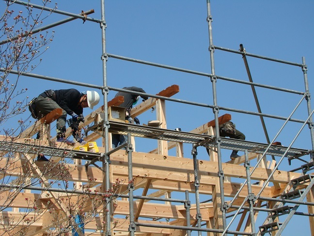 例によって、大型の重機、クレーン車が現場に入ってこれないので、今回も人海戦術を取ることになりました。30代の若い大工さん3名を含む7名で梁や屋根材を持ち上げるハードな1日となりましたが、天気にも恵まれて15:00に無事終了しました。